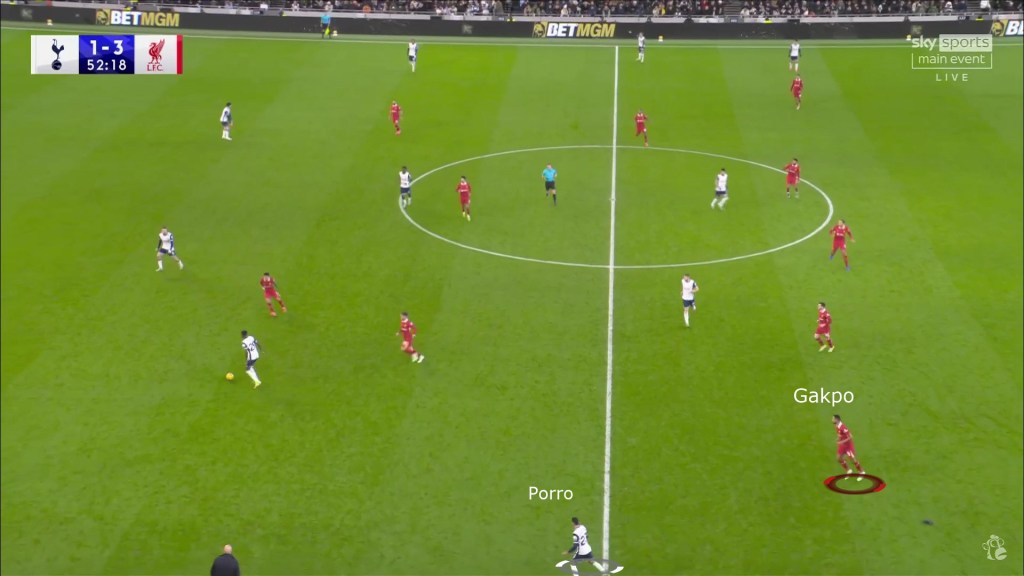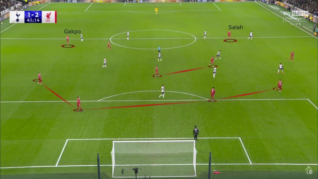 - Salah and Gakpo pinning back the Spurs fullback.