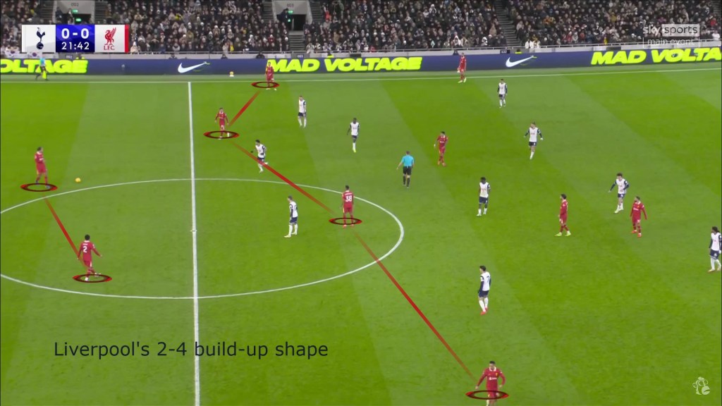 - They have a strict 4-2 or 2-4 shape in build-up with the two midfielders (MacAllister and Gravenberch) instructed to be in closer proximity to each other to offer options for bounce passes.