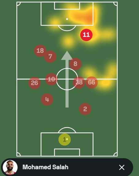 - Salah and Alexander-Arnold dominated the right side, with Salah frequently occupying the right half-space in the final third.