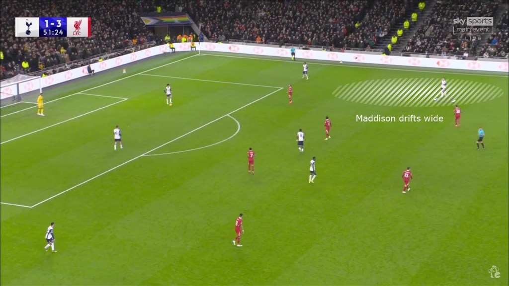- Maddison was the one to drift wider towards the left to form a 3 or 4 in midfield while one of the pivots (usually Bissouma) dropped deeper to build up play.
