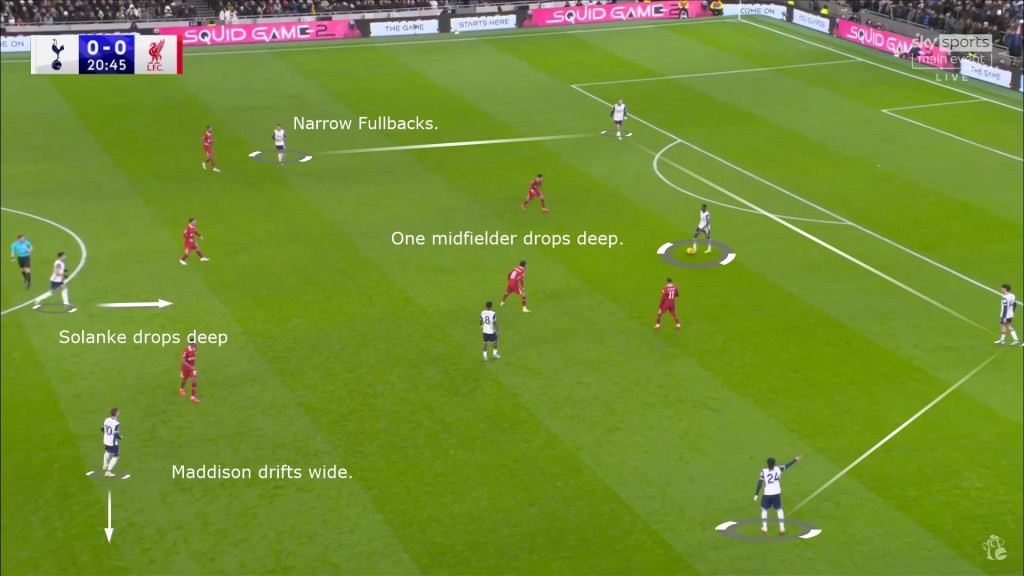 - Heavily rely on Kulusevski and Son as the primary outlets for progression while the CF Solanke drops deeper as an option for the bounce pass.