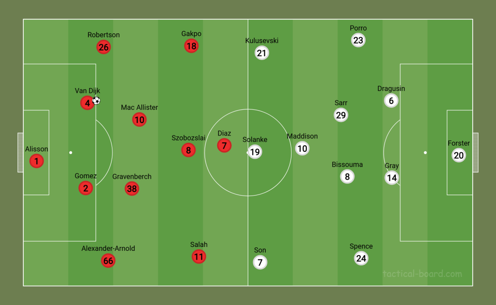 Liverpool began the match with a 4-2-3-1 formation that morphed into a 4-2-4 during attacking phases. This setup emphasized fluidity and attacking synergy among Salah, Szoboszlai, Diaz, and Gakpo, who seamlessly interchanged positions to unsettle Spurs’ defensive structure. Salah’s tendency to drift forward and into the right half-space complemented Alexander-Arnold’s advanced role, creating overloads on that flank.